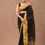 Elevate your ethnic wardrobe with this stunning Black and Gold Tie-Dye Maheshwari Silk Saree. This exquisite piece features a dramatic tie-dye pattern in black with golden highlights, creating a contemporary interpretation of traditional textile art. The saree is adorned with a luxurious hand-woven golden zari border that adds a touch of opulence to this modern masterpiece. The pallu showcases intricate golden patterns that beautifully contrast with the deep black background. Crafted from premium Maheshwari silk, this saree offers a lightweight feel with a subtle sheen that ensures elegant draping and comfortable wear. The saree comes complete with a matching fabric blouse piece, allowing you to create a coordinated ensemble. With a standard length of 5.30 meters and a 0.90-meter blouse piece, this versatile saree is perfect for evening events, cocktail parties, and festive celebrations where you want to make a bold statement while honoring traditional craftsmanship.