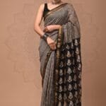 Embrace timeless elegance with this sophisticated Black and White Checkered Maheshwari Silk Saree. This refined piece features a classic checkered pattern meticulously printed on a pristine white background, creating a striking monochromatic appeal that exudes understated luxury. The saree transitions beautifully to a distinctive black pallu adorned with intricate paisley motifs in white, adding artistic dimension to this elegant creation. The saree is enhanced with an exquisite hand-woven golden zari border that frames the design with traditional opulence. Crafted from premium Maheshwari silk, this saree offers a lightweight feel with a subtle sheen that ensures graceful draping and comfortable wear throughout the day. The saree comes complete with a matching fabric blouse piece, allowing you to create a coordinated ensemble. With a standard length of 5.30 meters and a 0.90-meter blouse piece, this versatile saree is perfect for formal events, office wear, and elegant gatherings where you want to make a sophisticated statement with timeless black and white elegance.