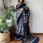 Make a bold statement with this Black Mulmul cotton saree featuring stunning multicolor Hand Block wax Batik Print in white, red, yellow, and green. This handcrafted masterpiece showcases the beauty of traditional artisanship on premium 92*80 pure cotton fabric with super dying technique. The 5.30-meter saree displays a harmonious blend of colorful floral motifs and geometric patterns that create a visually striking effect. The vibrant prints against the deep Black background offer a sophisticated yet festive look perfect for special occasions. Accompanied by a matching 0.90-meter blouse piece in the same exquisite fabric, this ensemble is ready to elevate your ethnic collection. The lightweight and breathable nature of Mulmul cotton ensures comfort throughout the day, making it ideal for both day and evening events.