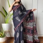 Make a sophisticated statement with this striking Black Cotton Mulmul saree featuring exquisite hand block printed peacock feather motifs in pristine white. This breathtaking piece showcases authentic hand block printing techniques on premium quality pure cotton super dying 92*80 fabric, ensuring both comfort and elegant appeal. The contrasting red border with intricate patterns adds a touch of sophistication to this lightweight and airy saree. Perfect for evening events and special occasions, this saree drapes beautifully and offers exceptional breathability, making it ideal for all-day wear. The saree comes with a matching fabric blouse piece to complete your ensemble. Each piece is meticulously crafted by skilled artisans, ensuring unique craftsmanship and attention to detail. The classic black color with white motifs and red accents makes this saree a standout addition to your collection, suitable for various celebrations throughout the year. Saree length: 5.30 meters; Blouse piece: 0.90 meters. Embrace the timeless charm of traditional Indian craftsmanship with this stunning Cotton Mulmul saree.