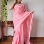 Elevate your ethnic wardrobe with this exquisite Blush Pink Cotton Mulmul saree featuring delicate hand block printed floral motifs in pristine white. This breathtaking piece showcases authentic hand block printing techniques on premium quality pure cotton super dying 92*80 fabric, ensuring both comfort and feminine elegance. The intricate border with traditional geometric patterns adds a touch of sophistication to this lightweight and airy saree. Perfect for summer occasions, festive celebrations, and daytime events, this saree drapes beautifully and offers exceptional breathability, making it ideal for all-day wear. The saree comes with a matching fabric blouse piece to complete your ensemble. Each piece is meticulously crafted by skilled artisans, ensuring unique craftsmanship and attention to detail. The soft pink color and intricate detailing make this saree a versatile addition to your collection, suitable for various occasions throughout the year. Saree length: 5.30 meters; Blouse piece: 0.90 meters. Embrace the timeless charm of traditional Indian craftsmanship with this stunning Cotton Mulmul saree.