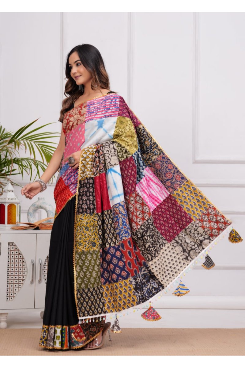 The saree features an elaborate arrangement of hand block printed patches across the pallu and border, creating a captivating mosaic of colors and patterns. Each patch displays unique designs including geometric motifs, floral patterns, and traditional prints in vibrant shades of red, pink, blue, yellow, and green. The thoughtful placement of these patches creates visual interest while maintaining elegant appeal. The entire saree is enhanced with delicate golden zari lace trim and playful tassels that add movement and a touch of festive charm.