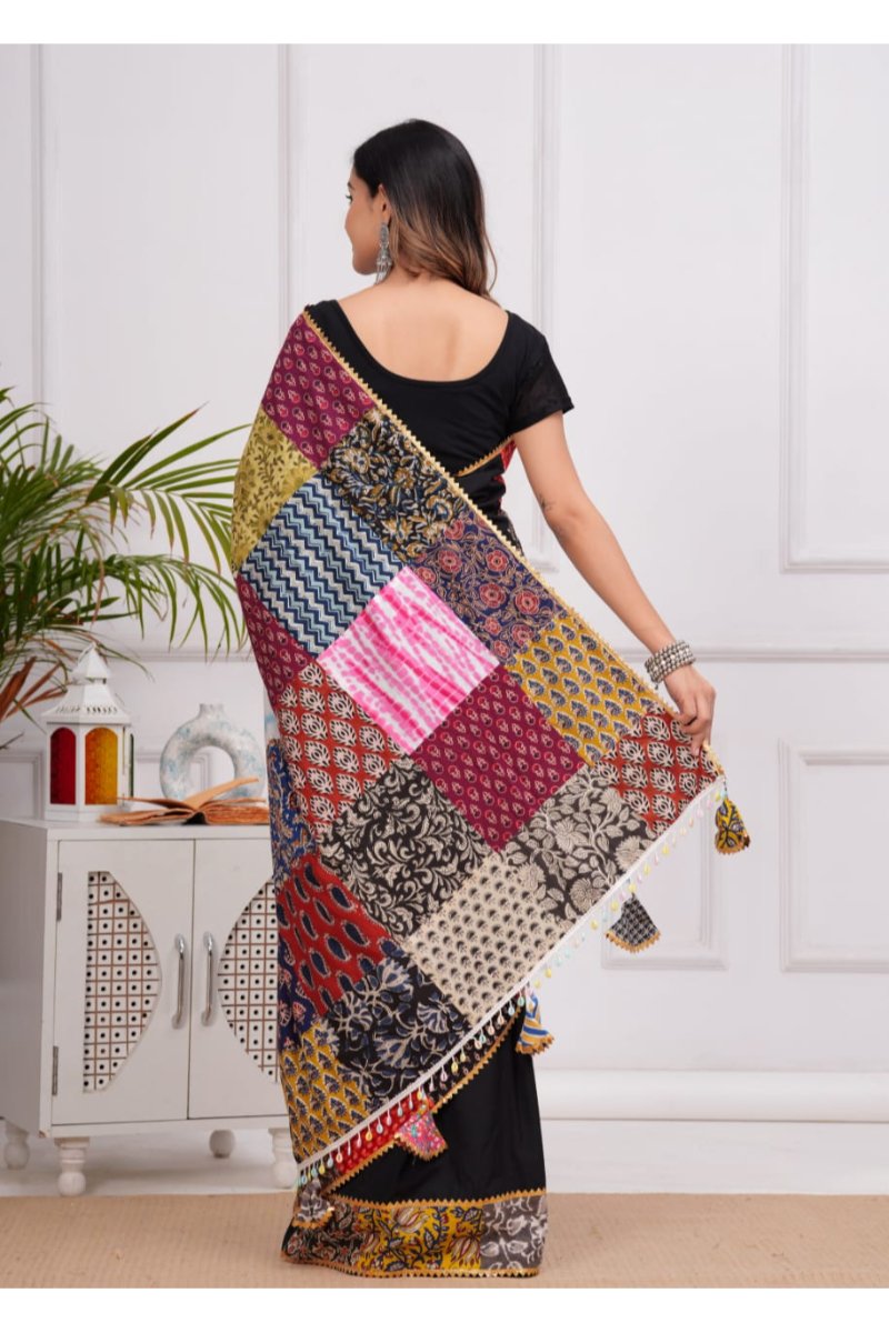 Add timeless elegance to your wardrobe with our Black Cotton Mulmul Saree that perfectly balances sophistication with artistic expression. Meticulously crafted from pure cotton mulmul fabric, this saree offers exceptional breathability and lightweight comfort that’s ideal for both everyday wear and special occasions. The classic black base provides a striking canvas that beautifully showcases the intricate patchwork artistry.