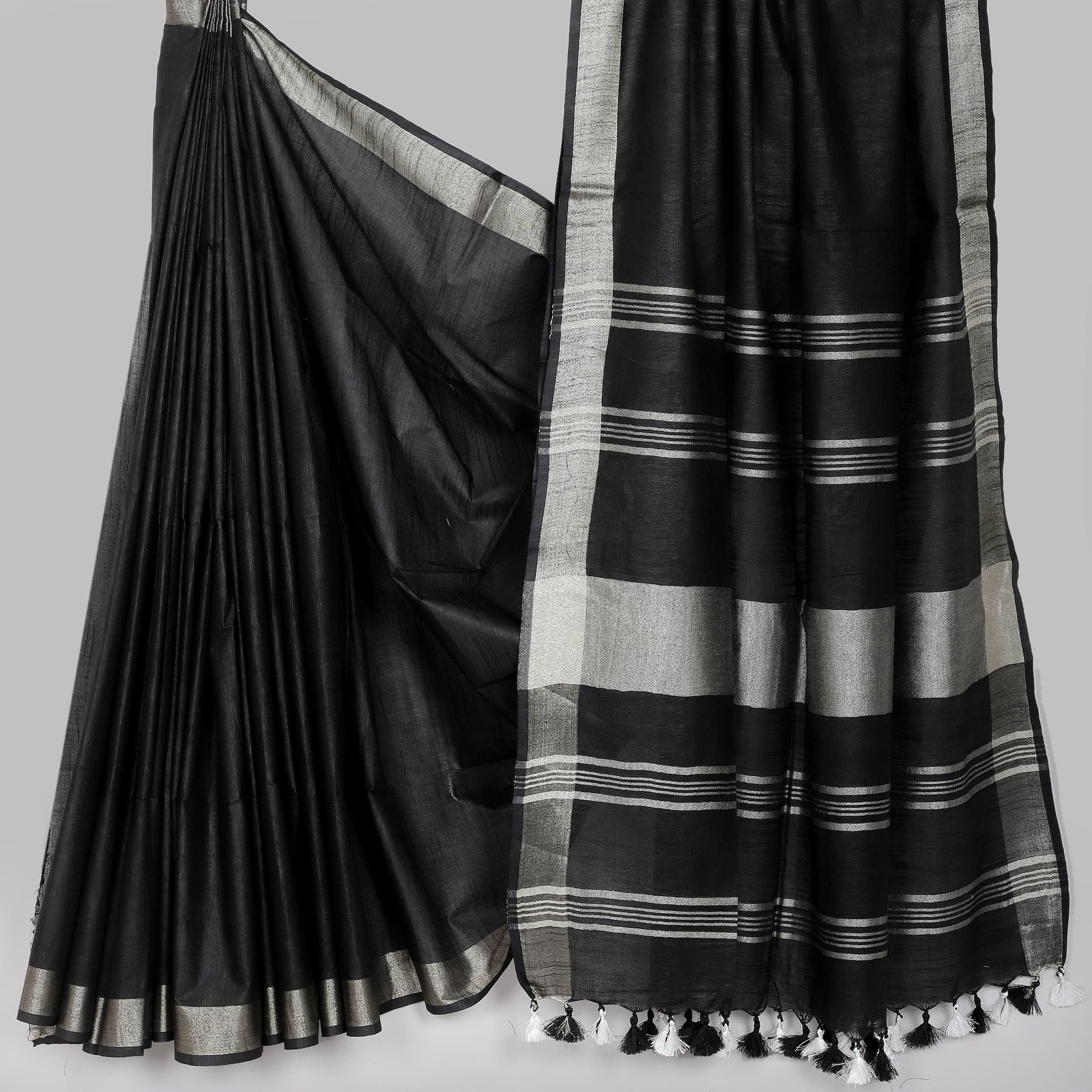 Make a powerful statement with our sophisticated Classic Black Linen Saree that embodies timeless elegance and versatility. This premium saree features a rich black hue that symbolizes power and mystery, perfect for formal events, evening gatherings, and professional settings. The saree is adorned with a luxurious silver zari border that adds a touch of opulence and creates a striking contrast against the deep black fabric. Each detail reflects the exceptional craftsmanship of skilled artisans who have preserved this traditional weaving technique.
