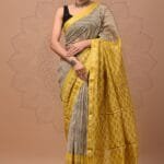 Radiate elegance with this exquisite hand block printed Cream and Yellow Maheshwari Silk Saree. This stunning piece features a harmonious blend of cream background with delicate black stripes, creating a sophisticated base for the artistic design. The saree transitions beautifully to a vibrant yellow pallu adorned with intricate paisley motifs that showcase the exceptional skill of traditional artisans. The luxurious hand-woven golden zari border adds a touch of opulence and festive charm to this masterpiece. Crafted from premium Maheshwari silk, this saree offers a lightweight feel with a subtle sheen that drapes gracefully, ensuring comfort throughout the day. The saree comes complete with a matching fabric blouse piece, allowing you to create a coordinated ensemble. With a standard length of 5.30 meters and a 0.90-meter blouse piece, this versatile saree is perfect for daytime functions, religious ceremonies, and cultural celebrations where you want to make a subtle yet impactful statement with your traditional attire.