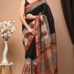 Indulge in luxury with this regal black Maheshwari Silk saree featuring an exquisite pallu adorned with intricate paisley patterns in beige with red accents. The saree is enhanced with a hand-woven designer golden zari border that adds a touch of opulence and traditional charm. The striking contrast between the deep black body and the detailed pallu creates a sophisticated look that’s perfect for formal events and special occasions. Each saree is meticulously hand block printed by skilled artisans, ensuring unique craftsmanship and attention to detail. The lightweight yet durable Maheshwari silk ensures comfortable draping while maintaining a luxurious feel. The saree comes with a matching fabric blouse piece to complete your ensemble. Make a statement at weddings, festivals, or corporate events with this elegant piece that beautifully combines traditional techniques with contemporary design. The classic color combination and intricate detailing make this saree a timeless addition to your ethnic wardrobe. Saree length: 5.30 meters; Blouse piece: 0.90 meters.