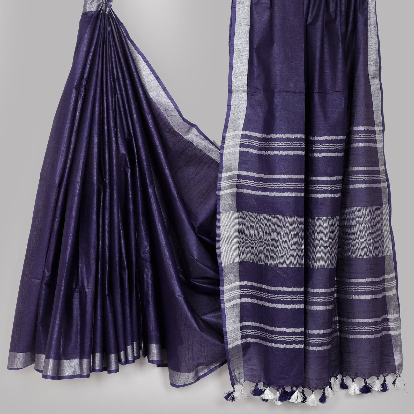 The lightweight linen fabric ensures comfort throughout the day while maintaining a graceful drape that flatters every body type. The delicate tassels along the pallu add movement and dimension to this classic piece. This versatile saree can be styled with a variety of blouses – pair it with a matching navy blue blouse for a monochromatic look or experiment with silver or contrasting colors for a bold statement. The breathable nature of linen makes this saree suitable for all seasons, ensuring you stay comfortable while looking effortlessly elegant.