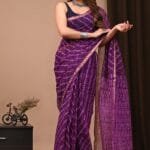 Indulge in the rich beauty of this stunning purple tie-dye Kota Doria cotton saree. The vibrant purple hue is adorned with intricate tie-dye patterns, creating a mesmerizing visual effect. Hand block printed by skilled artisans, this saree showcases the perfect blend of traditional craftsmanship and contemporary design. The golden zari border adds a touch of luxury, making it ideal for festive occasions. The lightweight cotton fabric ensures comfort and elegant draping. Comes with a matching blouse piece. Saree length: 5.30 meters, Blouse piece: 0.90 meters. Each piece features unique tie-dye patterns, making it truly one-of-a-kind.