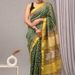 Embrace nature’s elegance with this stunning emerald green Maheshwari Silk saree adorned with delicate golden motifs throughout the body. This exquisite piece features a vibrant yellow border with intricate traditional patterns and a hand-woven designer golden zari border that adds a touch of royal charm. The striking combination of emerald green and sunshine yellow creates a refreshing look that’s perfect for festive occasions and celebrations. Each saree is meticulously hand block printed by skilled artisans, ensuring unique craftsmanship and attention to detail. The lightweight yet durable Maheshwari silk ensures comfortable draping while maintaining a luxurious feel. The saree comes with a matching fabric blouse piece to complete your ensemble. Make a statement at weddings, festivals, or special gatherings with this elegant piece that beautifully combines traditional techniques with contemporary design. The rich color palette and intricate detailing make this saree a timeless addition to your ethnic wardrobe. Saree length: 5.30 meters; Blouse piece: 0.90 meters.
