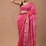 Add a splash of color to your ethnic wardrobe with this vibrant fuchsia pink Maheshwari Silk saree featuring elegant leheriya (diagonal) tie-dye patterns in white. This exquisite piece is adorned with a hand-woven designer golden zari border that adds a touch of royal elegance to the overall design. The striking combination of bright pink and golden accents creates a festive look that’s perfect for celebrations and special occasions. Each saree is meticulously hand block printed by skilled artisans using traditional techniques, ensuring unique craftsmanship and attention to detail. The lightweight yet durable Maheshwari silk ensures comfortable draping while maintaining a luxurious feel. The saree comes with a matching fabric blouse piece to complete your ensemble. Make a statement at weddings, festivals, or formal gatherings with this elegant piece that beautifully combines traditional techniques with contemporary design. The vibrant color and timeless pattern make this saree a versatile addition to your collection. Saree length: 5.30 meters; Blouse piece: 0.90 meters.