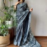 Make a sophisticated statement with this striking Gray Cotton Mulmul saree featuring exquisite Dabu (Mud) Print in pristine white. This breathtaking piece showcases authentic hand block printing techniques on premium quality pure cotton super dying 92*80 fabric, ensuring both comfort and elegant appeal. The intricate geometric border with traditional patterns adds a touch of sophistication to this lightweight and airy saree. Perfect for professional settings and formal occasions, this saree drapes beautifully and offers exceptional breathability, making it ideal for all-day wear. The saree comes with a matching fabric blouse piece to complete your ensemble. Each piece is meticulously crafted by skilled artisans, ensuring unique craftsmanship and attention to detail. The versatile gray color and intricate detailing make this saree a standout addition to your collection, suitable for various occasions throughout the year. Saree length: 5.30 meters; Blouse piece: 0.90 meters. Embrace the timeless charm of traditional Indian craftsmanship with this stunning Cotton Mulmul saree.