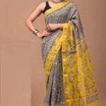 Make a sophisticated style statement with this elegant hand block printed Maheshwari Silk saree featuring a stunning grey body adorned with geometric patterns and a contrasting yellow pallu with intricate motifs. The saree is enhanced with a hand-woven designer golden zari border that adds a touch of luxury and traditional charm. The unique combination of grey and yellow creates a contemporary look while honoring traditional aesthetics. Each pattern is meticulously block printed by skilled artisans, making every saree a unique piece of art. The saree comes with a matching fabric blouse piece to complete your ensemble. Perfect for both formal events and festive occasions, this versatile saree combines comfort with elegance. Drape yourself in this masterpiece and experience the rich heritage of Maheshwari silk. Saree length: 5.30 meters; Blouse piece: 0.90 meters.