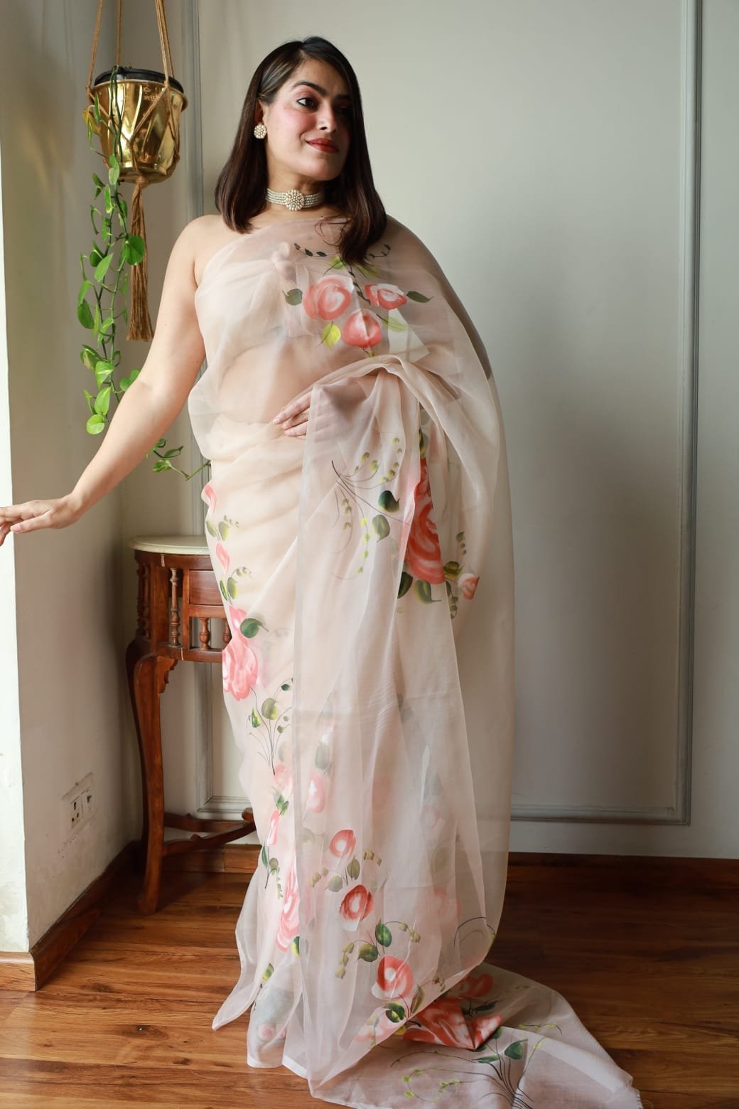 Embrace timeless sophistication with our Ivory Rosette hand painted organza silk saree. This ethereal creation features a luminous off-white organza base that provides the perfect canvas for the exquisite hand-painted coral and pink roses that bloom across its surface. The delicate interplay between the subtle background and the vibrant floral elements creates a harmonious composition that speaks of refined elegance. Each rose is meticulously rendered by master artisans using traditional techniques, ensuring every saree is a unique masterpiece that celebrates India’s rich artistic heritage. The lightweight, diaphanous fabric creates a dreamy silhouette that flows gracefully with movement, perfect for weddings, engagement ceremonies, or any occasion where subtle luxury is desired. This 6.5-meter creation comes complete with a matching blouse piece, offering endless styling possibilities for the modern woman who appreciates the perfect balance between classic aesthetics and contemporary elegance.