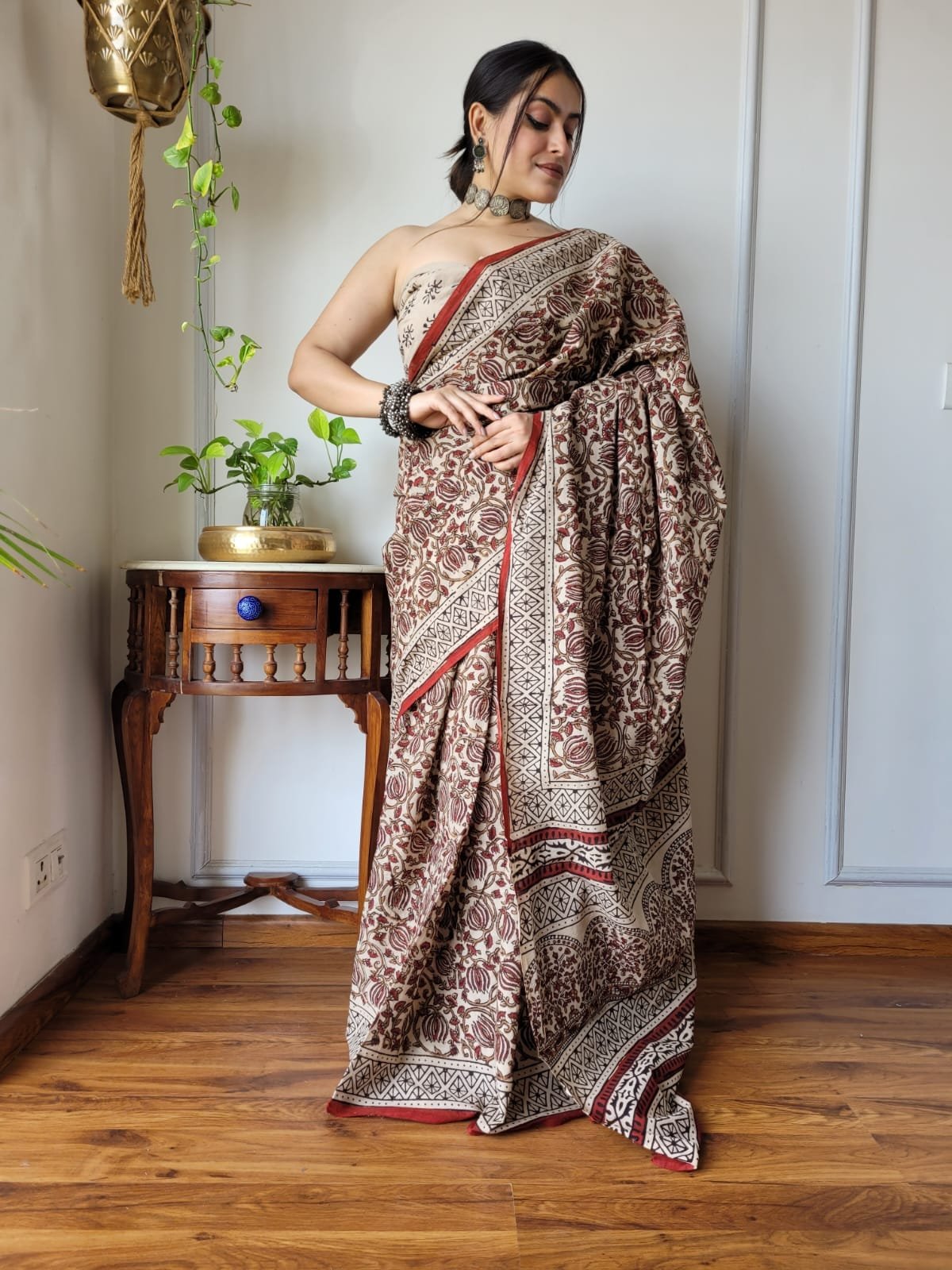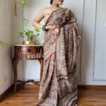 Embrace understated elegance with this sophisticated Beige Cotton Mulmul saree featuring delicate Kalamkari hand block printed floral motifs in rich maroon. This breathtaking piece showcases authentic hand block printing techniques on premium quality pure cotton super dying 92*80 fabric, ensuring both comfort and timeless appeal. The contrasting red border with traditional patterns adds a touch of sophistication to this lightweight and airy saree. Perfect for both professional settings and casual gatherings, this saree drapes beautifully and offers exceptional breathability, making it ideal for all-day wear. The saree comes with a matching fabric blouse piece to complete your ensemble. Each piece is meticulously crafted by skilled artisans, ensuring unique craftsmanship and attention to detail. The subtle color palette and intricate detailing make this saree a versatile addition to your collection, suitable for various occasions throughout the year. Saree length: 5.30 meters; Blouse piece: 0.90 meters. Embrace the timeless charm of traditional Indian craftsmanship with this stunning Cotton Mulmul saree.