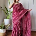 Make a vibrant statement with this stunning Maroon Cotton Mulmul saree featuring delicate hand block printed leaf motifs in pristine white. This breathtaking piece showcases authentic hand block printing techniques on premium quality pure cotton super dying 92*80 fabric, ensuring both comfort and eye-catching appeal. The decorative border with intricate patterns adds a touch of sophistication to this lightweight and airy saree. Perfect for festive celebrations and special occasions, this saree drapes beautifully and offers exceptional breathability, making it ideal for all-day wear. The saree comes with a matching fabric blouse piece to complete your ensemble. Each piece is meticulously crafted by skilled artisans, ensuring unique craftsmanship and attention to detail. The rich Maroon color and intricate detailing make this saree a standout addition to your collection, suitable for various celebrations throughout the year. Saree length: 5.30 meters; Blouse piece: 0.90 meters. Embrace the timeless charm of traditional Indian craftsmanship with this stunning Cotton Mulmul saree.