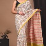 Experience the epitome of elegance with this ethereal off-white Chanderi silk saree. The saree showcases exquisite block printing with intricate floral motifs spread across the body, creating a harmonious pattern that speaks of skilled craftsmanship. The distinctive yellow border adds a contemporary touch while maintaining traditional appeal. The pallu features a unique striped pattern with floral elements, making it a perfect conversation starter. Crafted from pure Chanderi silk, this 5.30-meter saree comes with a matching 0.90-meter blouse piece. The lightweight fabric ensures comfortable wear while the intricate detailing makes it suitable for both festive occasions and formal events. Each block print is carefully executed by skilled artisans, making every piece unique.