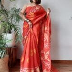 Make a statement with this vibrant Orange Mulmul cotton saree featuring elegant white and yellow Hand Block Wax Batik prints. This handcrafted piece showcases the beauty of traditional artisanship on premium 92*80 pure cotton fabric with super dying technique. The 5.30-meter saree displays a harmonious blend of floral motifs and geometric patterns that create a visually appealing effect. The contrasting prints against the warm Orange background offer a fresh and contemporary look perfect for summer occasions and festive celebrations. Accompanied by a matching 0.90-meter blouse piece in the same exquisite fabric, this ensemble is ready to elevate your ethnic wardrobe. The lightweight and breathable nature of Mulmul cotton ensures all-day comfort, making it ideal for both casual outings and special events.