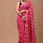 Add a splash of color to your ethnic wardrobe with this vibrant Pink Maheshwari Silk saree featuring elegant leheriya (diagonal) tie-dye patterns in white. This exquisite piece is adorned with a hand-woven designer golden zari border that adds a touch of royal elegance to the overall design. The striking combination of bright pink and golden accents creates a festive look that’s perfect for celebrations and special occasions. Each saree is meticulously hand block printed by skilled artisans using traditional techniques, ensuring unique craftsmanship and attention to detail. The lightweight yet durable Maheshwari silk ensures comfortable draping while maintaining a luxurious feel. The saree comes with a matching fabric blouse piece to complete your ensemble. Make a statement at weddings, festivals, or formal gatherings with this elegant piece that beautifully combines traditional techniques with contemporary design. The vibrant color and timeless pattern make this saree a versatile addition to your collection. Saree length: 5.30 meters; Blouse piece: 0.90 meters.