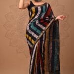 Make a vibrant style statement with this exquisite hand block printed Maheshwari Silk saree featuring stunning multi-colored stripes in black, yellow, red, green, and white. This artistic masterpiece is adorned with a hand-woven designer golden zari border that adds a touch of royal elegance to the overall design. The harmonious blend of colors creates a contemporary yet traditional look that’s perfect for both festive occasions and formal events. Each saree is meticulously crafted by skilled artisans, ensuring unique craftsmanship and attention to detail. The lightweight yet durable Maheshwari silk ensures comfortable draping while maintaining a luxurious feel. The saree comes with a matching fabric blouse piece to complete your ensemble. Make a statement at cultural celebrations, social gatherings, or special occasions with this elegant piece that beautifully combines traditional techniques with modern aesthetics. The vibrant color palette and intricate detailing make this saree a valuable addition to your ethnic wardrobe. Saree length: 5.30 meters; Blouse piece: 0.90 meters.