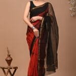 Experience the perfect fusion of contemporary style and traditional craftsmanship with this stunning red and black tie-dye Kota Doria cotton saree. The dramatic color combination creates a bold statement while maintaining elegance through its intricate hand block printing. The saree features a luxurious golden zari border that adds a festive touch to its modern design. The lightweight cotton fabric ensures all-day comfort. Complete with a matching blouse piece. Saree length: 5.30 meters, Blouse piece: 0.90 meters. Each piece showcases unique tie-dye patterns, making it truly one-of-a-kind.