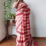 Embrace artistic elegance with this red Mulmul cotton saree featuring stunning white Hand Block Wax Batik Print-inspired patterns and zigzag designs. This handcrafted masterpiece showcases the beauty of traditional tie-dye and block printing techniques on premium 92*80 pure cotton fabric with super dying process. The 5.30-meter saree displays a harmonious blend of geometric motifs and striped patterns that create a visually dynamic effect. The contrasting white prints against the vibrant red background offer a bold and festive look perfect for celebrations and special occasions. Accompanied by a matching 0.90-meter blouse piece in the same exquisite fabric, this ensemble is ready to make a statement. The lightweight and breathable nature of Mulmul cotton ensures comfort throughout the day, making it ideal for both casual outings and festive gatherings.