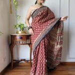 Make a bold statement with this vibrant Red Cotton Mulmul saree featuring exquisite hand block printed geometric triangle motifs in white. This breathtaking piece showcases authentic hand block printing techniques on premium quality pure cotton super dying 92*80 fabric, ensuring both comfort and striking appeal. The contrasting black border with intricate traditional patterns adds a touch of sophistication to this lightweight and airy saree. Perfect for festive celebrations and special occasions, this saree drapes beautifully and offers exceptional breathability, making it ideal for all-day wear. The saree comes with a matching fabric blouse piece to complete your ensemble. Each piece is meticulously crafted by skilled artisans, ensuring unique craftsmanship and attention to detail. The rich red color and intricate detailing make this saree a standout addition to your collection, suitable for various celebrations throughout the year. Saree length: 5.30 meters; Blouse piece: 0.90 meters. Embrace the timeless charm of traditional Indian craftsmanship with this stunning Cotton Mulmul saree.