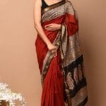 Radiate timeless elegance with this stunning Red Maheshwari Silk saree featuring an exquisite border adorned with intricate geometric patterns in beige and black. This masterpiece is enhanced with a hand-woven designer golden zari border that adds a touch of royal charm to the overall design. The rich ruby red color is complemented by the detailed border work, creating a sophisticated look that’s perfect for weddings, festive celebrations, and special occasions. Each saree is meticulously hand block printed by skilled artisans, ensuring unique craftsmanship and attention to detail. The lightweight yet durable Maheshwari silk ensures comfortable draping while maintaining a luxurious feel. The saree comes with a matching fabric blouse piece to complete your ensemble. Make a statement at cultural gatherings, formal events, or traditional ceremonies with this elegant piece that beautifully combines classic aesthetics with contemporary appeal. The timeless color and intricate detailing make this saree a valuable addition to your ethnic wardrobe. Saree length: 5.30 meters; Blouse piece: 0.90