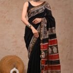 Indulge in luxury with this regal black Maheshwari Silk saree featuring an exquisite pallu adorned with intricate paisley patterns in beige and red hues. The saree is enhanced with a hand-woven designer golden zari border that adds a touch of opulence and traditional charm. The striking contrast between the deep black body and the detailed pallu with red accents creates a sophisticated look that’s perfect for formal events and special occasions. Each saree is meticulously hand block printed by skilled artisans, ensuring unique craftsmanship and attention to detail. The lightweight yet durable Maheshwari silk ensures comfortable draping while maintaining a luxurious feel. The saree comes with a matching fabric blouse piece to complete your ensemble. Make a statement at weddings, festivals, or corporate events with this elegant piece that beautifully combines traditional techniques with contemporary design. Saree length: 5.30 meters; Blouse piece: 0.90 meters.