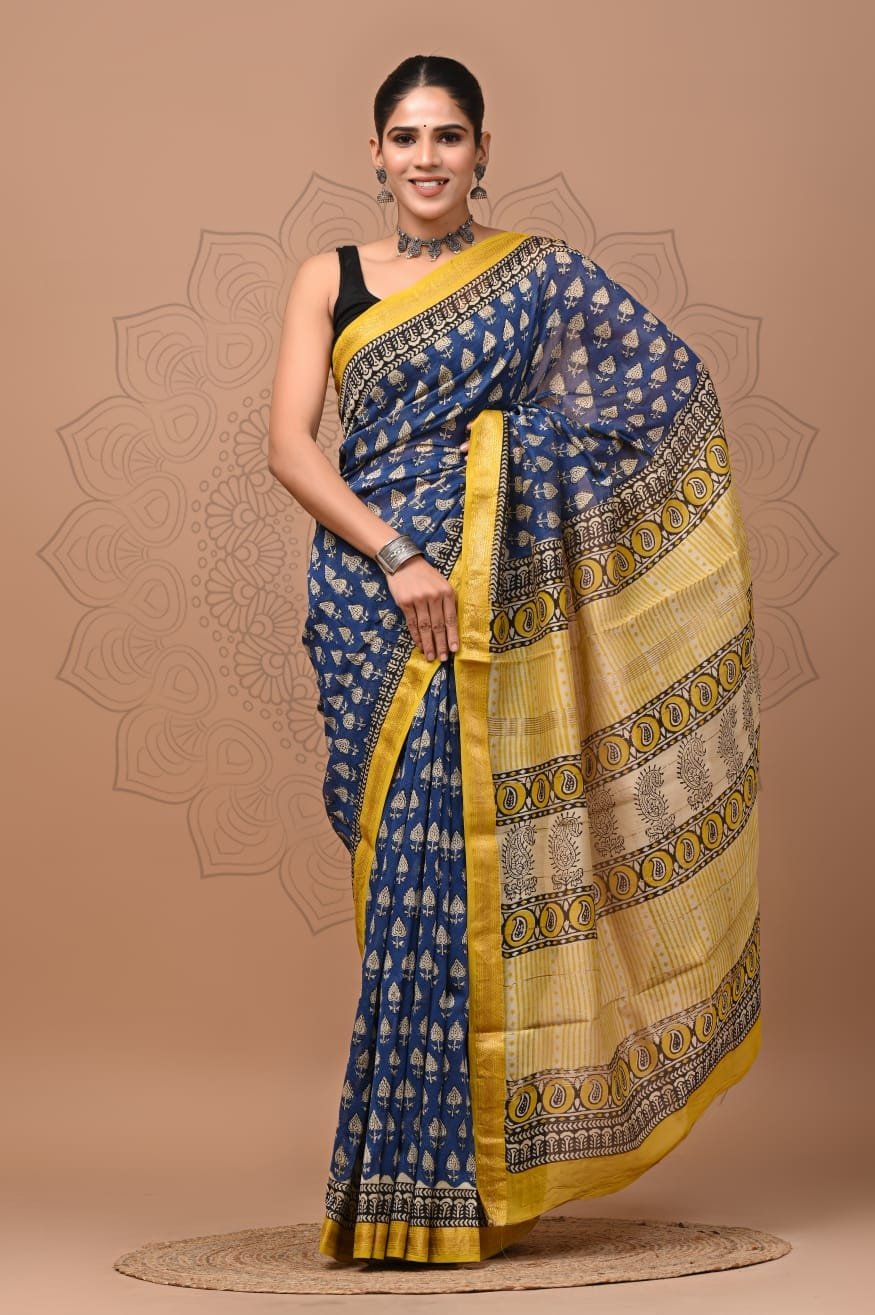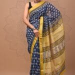 Make a regal statement with this magnificent Royal Blue and Yellow Maheshwari Silk Saree. This stunning piece features a rich royal blue background adorned with delicate golden motifs, creating an elegant pattern that exudes luxury and sophistication. The saree transitions beautifully to a vibrant yellow pallu with intricate traditional block prints and paisley patterns that showcase exceptional artisanal skill. The saree is enhanced with a meticulously hand-woven golden zari border that adds a touch of opulence and festive charm to this royal creation. Crafted from premium Maheshwari silk, this saree offers a lightweight feel with a subtle sheen that ensures graceful draping and comfortable wear throughout the day. The saree comes complete with a matching fabric blouse piece, allowing you to create a coordinated ensemble. With a standard length of 5.30 meters and a 0.90-meter blouse piece, this versatile saree is perfect for weddings, festive celebrations, and special occasions where you want to make a bold and elegant statement with your traditional attire.