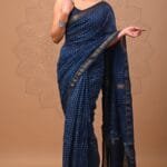 Embrace timeless elegance with this stunning Royal Blue Checkered Maheshwari Silk Saree. This magnificent piece features a classic white grid pattern meticulously printed on a rich royal blue background, creating a sophisticated visual appeal that stands out in any gathering. The saree is enhanced with an exquisite hand-woven golden zari border that adds a touch of luxury and festive charm. The traditional craftsmanship is evident in every detail, from the precise checkered pattern to the intricate border work. Crafted from premium Maheshwari silk, this saree offers a lightweight feel with a subtle sheen that ensures comfortable wear throughout the day. The saree comes complete with a matching fabric blouse piece, allowing you to create a coordinated ensemble. With a standard length of 5.30 meters and a 0.90-meter blouse piece, this versatile saree is perfect for formal events, religious ceremonies, and cultural celebrations where you want to make an elegant statement while honoring traditional aesthetics.