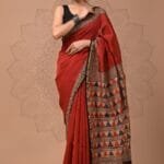 Make a striking statement with this exquisite handcrafted Chanderi silk saree. The rich rust red body is beautifully complemented by an intricately designed geometric pallu, creating a perfect balance of color and pattern.