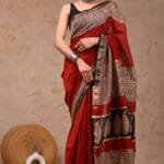 Radiate timeless charm with this stunning ruby red Maheshwari Silk saree featuring an exquisite border adorned with intricate geometric patterns in beige and black. This masterpiece is enhanced with a hand-woven designer golden zari border that adds a touch of royal elegance to the overall design. The rich ruby red color is complemented by the detailed border work, creating a sophisticated look that’s perfect for weddings, festive celebrations, and special occasions. Each saree is meticulously hand block printed by skilled artisans, ensuring unique craftsmanship and attention to detail. The lightweight yet durable Maheshwari silk ensures comfortable draping while maintaining a luxurious feel. The saree comes with a matching fabric blouse piece to complete your ensemble. Make a statement at cultural gatherings, formal events, or traditional ceremonies with this elegant piece that beautifully combines classic aesthetics with contemporary appeal. The timeless color and intricate detailing make this saree a valuable addition to your ethnic wardrobe. Saree length: 5.30 meters; Blouse piece: