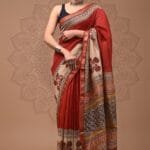 Make a striking impression with this captivating hand block printed Maheshwari Silk Saree in a beautiful rustic red hue. This exceptional piece features a harmonious blend of red and cream sections, adorned with intricate geometric patterns and delicate floral motifs. The saree showcases the exceptional craftsmanship of traditional artisans with its hand-woven designer golden zari border that adds a touch of luxury. The cream pallu with red floral motifs creates a stunning contrast that draws attention and admiration. Crafted from premium Maheshwari silk, this saree offers a lightweight feel with a subtle sheen that drapes beautifully on any body type. The saree comes complete with a matching fabric blouse piece, allowing you to create a coordinated ensemble. With a standard length of 5.30 meters and a 0.90-meter blouse piece, this versatile saree is perfect for festive celebrations, cultural events, and special occasions where you want to showcase your refined taste in traditional attire.