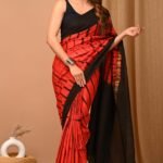 Make a bold statement with this captivating red and black Assam silk saree that perfectly balances dramatic contrast with artistic elegance. This stunning piece showcases masterful shibori tie-dye techniques creating geometric patterns that flow beautifully throughout the drape. The vibrant red base is accentuated by sharp black borders and intricate tie-dye lines, creating a contemporary yet timeless aesthetic.
