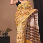 Elevate your ethnic wardrobe with this exquisite sunshine yellow hand block printed Chanderi silk saree from Tanviya. This masterpiece showcases intricate floral and botanical motifs meticulously hand-printed by skilled artisans, celebrating India’s rich textile heritage. The vibrant yellow base provides the perfect canvas for the detailed floral patterns in rich hues of purple, green, and red, creating a stunning visual harmony.