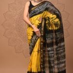 Elevate your ethnic wardrobe with this exquisite hand block printed Maheshwari Silk saree in vibrant sunshine yellow with striking black shibori tie-dye patterns. This masterpiece features traditional hand-woven designer golden zari borders that add a touch of royal elegance to your ensemble. The contrasting black and white tie-dye patterns create a mesmerizing visual effect that draws attention and admiration. Crafted by skilled artisans, this premium Maheshwari silk saree combines traditional craftsmanship with contemporary design elements. The saree comes with a matching fabric blouse piece to complete your look. Perfect for festive occasions, weddings, and special celebrations, this saree ensures you stand out with its unique color combination and impeccable craftsmanship. Saree length: 5.30 meters; Blouse piece: 0.90 meters.