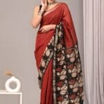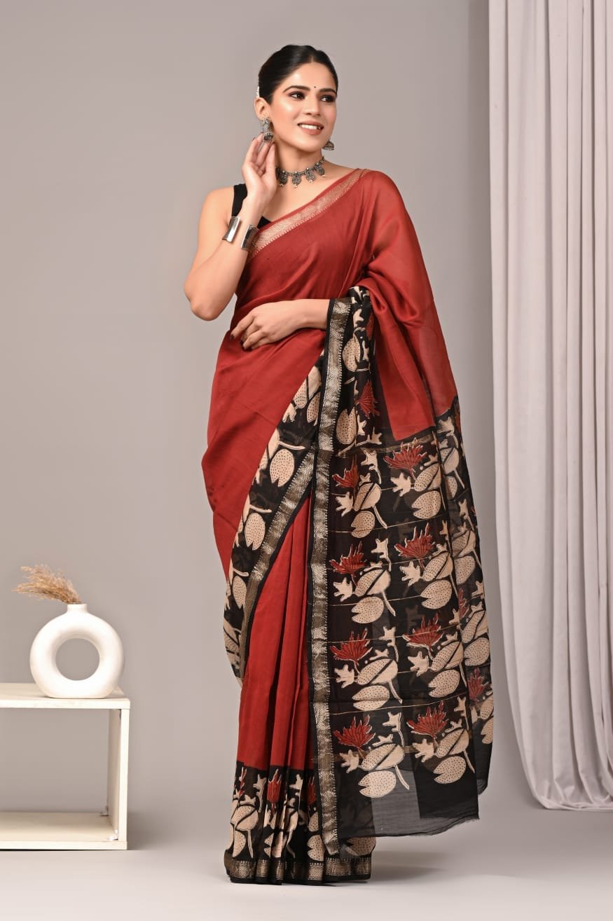 Embrace earthy elegance with this stunning terracotta red Maheshwari Silk saree featuring an exquisite black pallu adorned with intricate floral and lotus motifs. This masterpiece is enhanced with a hand-woven designer golden zari border that adds a touch of royal charm to the overall design. The striking contrast between the warm terracotta body and the detailed black pallu creates a sophisticated look that’s perfect for both formal events and festive occasions. Each saree is meticulously hand block printed by skilled artisans, ensuring unique craftsmanship and attention to detail. The lightweight yet durable Maheshwari silk ensures comfortable draping while maintaining a luxurious feel. The saree comes with a matching fabric blouse piece to complete your ensemble. Make a statement at weddings, cultural celebrations, or corporate events with this elegant piece that beautifully combines traditional techniques with contemporary design. The rich color palette and intricate detailing make this saree a timeless addition to your ethnic wardrobe. Saree length: 5.30 meters; Blouse piece: 0.90