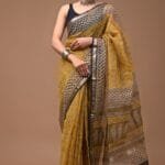 Embrace elegance with this exquisite hand block printed Kota Doria cotton saree in rich mustard yellow. The saree showcases intricate geometric patterns along its border, complemented by traditional motifs that tell a story of Indian craftsmanship. Enhanced with a luxurious golden zari border, this lightweight cotton saree offers both comfort and style. The matching blouse piece completes this ensemble perfectly. Saree length: 5.30 meters, Blouse piece: 0.90 meters. Each piece is meticulously crafted by skilled artisans.Washing Care: