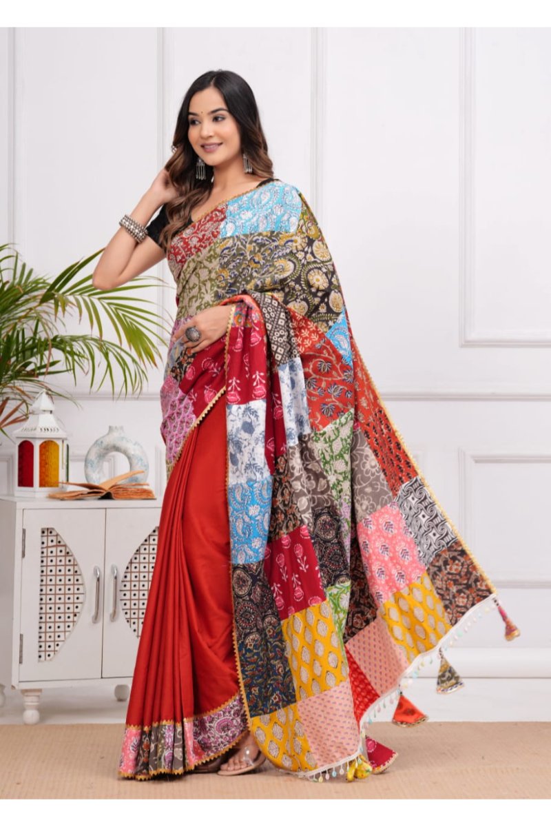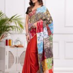 Embrace sustainable elegance with our Crimson Red Cotton Mulmul Saree that celebrates traditional craftsmanship with contemporary flair. Expertly handcrafted from pure cotton mulmul fabric, this saree offers exceptional breathability and featherlight comfort that’s perfect for year-round wear. The rich crimson red base creates a bold canvas that beautifully highlights the intricate patchwork detailing.