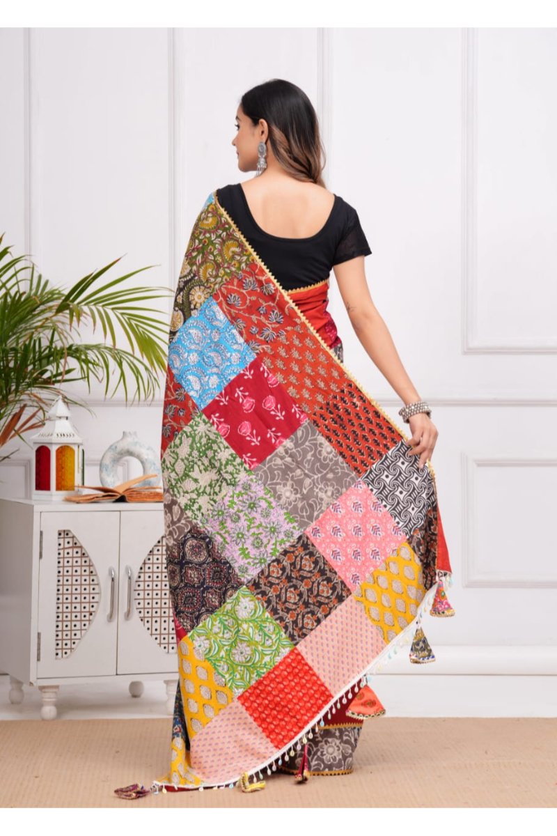 What sets this saree apart is the artistic arrangement of hand block printed patches that adorn the pallu and border. Each patch features unique designs including floral motifs, geometric patterns, and traditional prints in a harmonious blend of blue, green, yellow, red, and brown hues. The thoughtful placement of these colorful patches creates a stunning visual narrative while maintaining sophisticated elegance. The entire saree is enhanced with delicate golden zari lace trim and charming tassels that add movement and festive appeal.