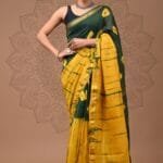 Make a bold fashion statement with this breathtaking yellow-green Maheshwari silk saree featuring an artistic tie-dye effect. The vibrant yellow dominates the body with elegant green accents creating a stunning contrast that catches the eye. This handcrafted piece showcases the exceptional skill of traditional artisans with its hand-woven designer golden zari border that adds a touch of luxury. The unique tie-dye pattern creates a one-of-a-kind look, ensuring you stand out at any gathering. The 5.30-meter saree comes complete with a matching 0.90-meter blouse piece in the same premium fabric. The lightweight yet durable Maheshwari silk ensures comfort throughout the day while maintaining its graceful drape. Perfect for festivals, celebrations, or any occasion where you want to showcase your distinctive style and appreciation for traditional craftsmanship.