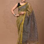 The saree features a vibrant yellow body adorned with delicate black block printed motifs, creating a mesmerizing visual effect.